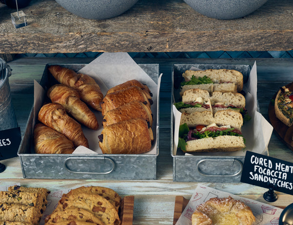 The rustic metal finish adds a modern, industrial look that complements a wide range of buffet and café setups.