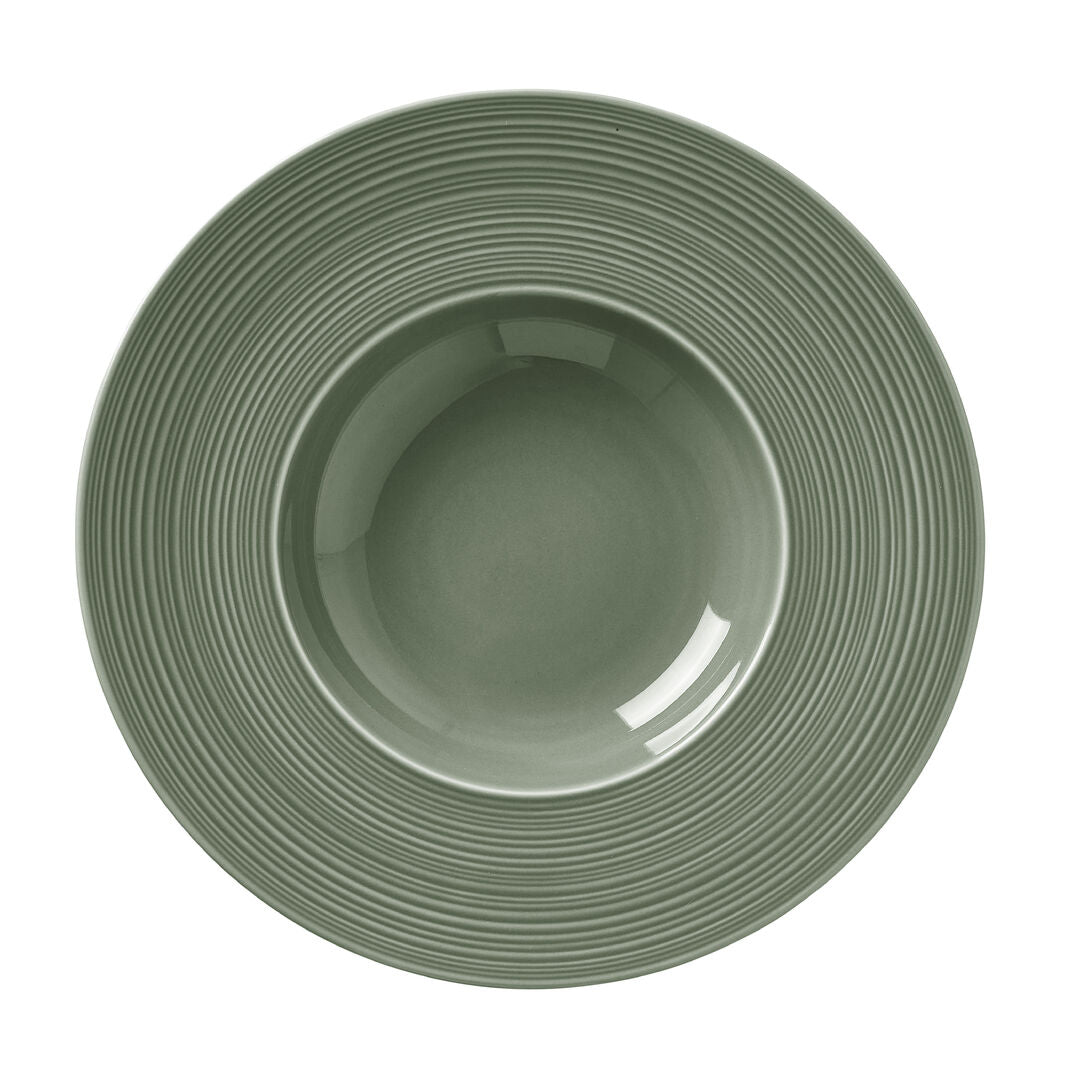 Finished in a natural fern green glaze, this porcelain pasta bowl features a wide rim with subtle concentric detailing, framing dishes beautifully while providing ample space for creative plating.