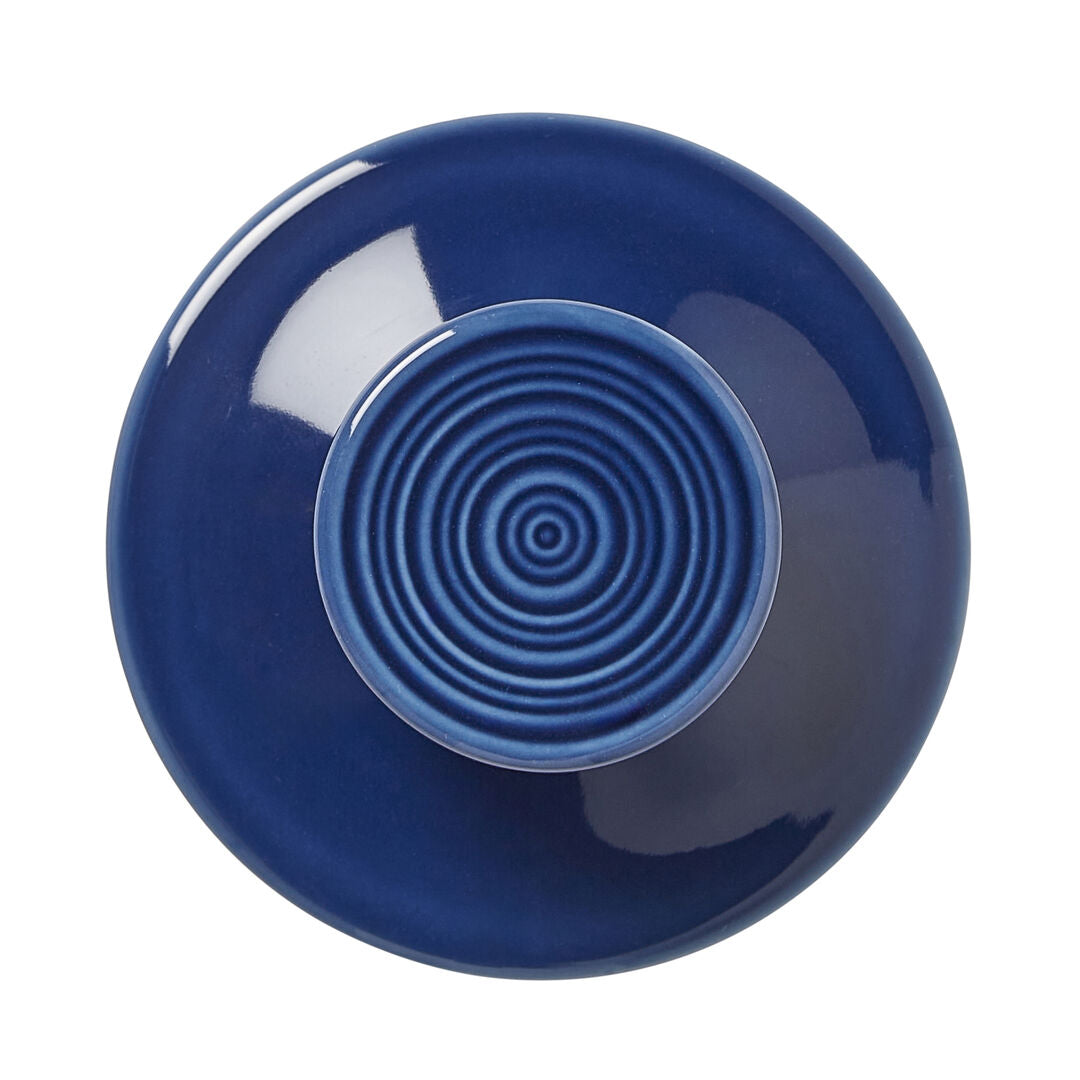 Crafted from durable porcelain, this lid features a deep midnight blue glaze with distinctive concentric rib detailing, enhancing both grip and visual appeal. It helps retain heat while protecting beverages during service.