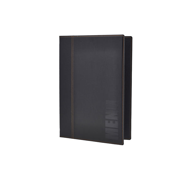 This contemporary black menu holder features a premium leather-look PU finish with a modern, double-stitched front cover. Its subtle embossed “MENU” text gives a sleek, professional appearance suitable for restaurants, cafés, hotels and bars. Designed for durability, it resists scratches, handling wear, and frequent daily use.