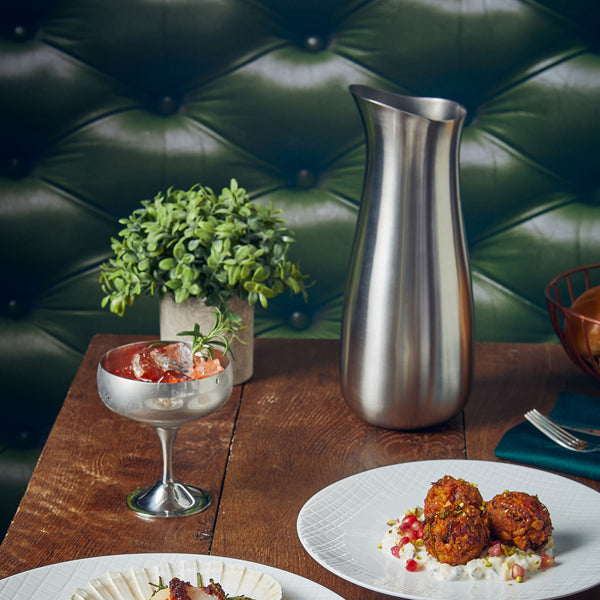 Stainless steel curved water jug designed for professional table service in hospitality and catering environments. Featuring an elegant curved silhouette and brushed finish, this jug provides a refined presentation suitable for restaurants, hotels, and event service.