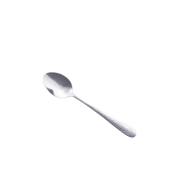 This stainless steel tea spoon features a contemporary hammered handle and a highly polished finish, offering a refined and durable option for professional hospitality settings. The textured embossment enhances grip while adding a stylish touch suitable for both formal and casual dining environments.