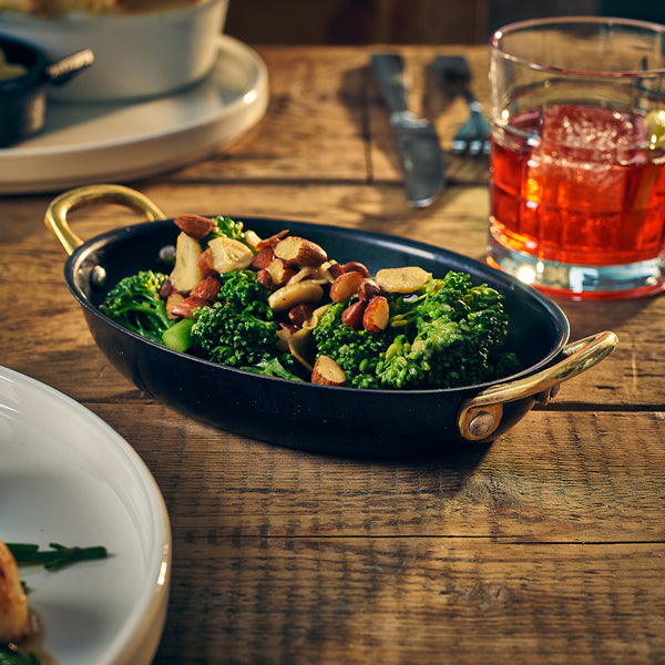 This black vintage steel oval dish offers a premium and durable presentation option for sides, starters, tapas and desserts in restaurants, gastropubs and upscale casual dining environments. Crafted from strong stainless steel with a matt black PVD coating, it delivers excellent resistance to scratches and wear while showcasing a striking industrial aesthetic.