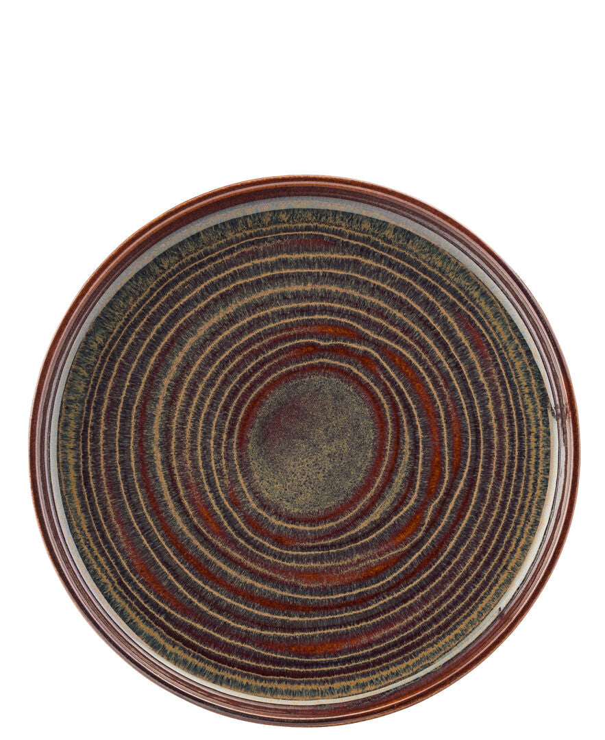 Tropical stoneware coupe plates designed for professional hospitality and catering environments. Finished in rich red and brown tones with a distinctive concentric textured glaze, these plates provide a bold and eye-catching backdrop for contemporary food presentation.